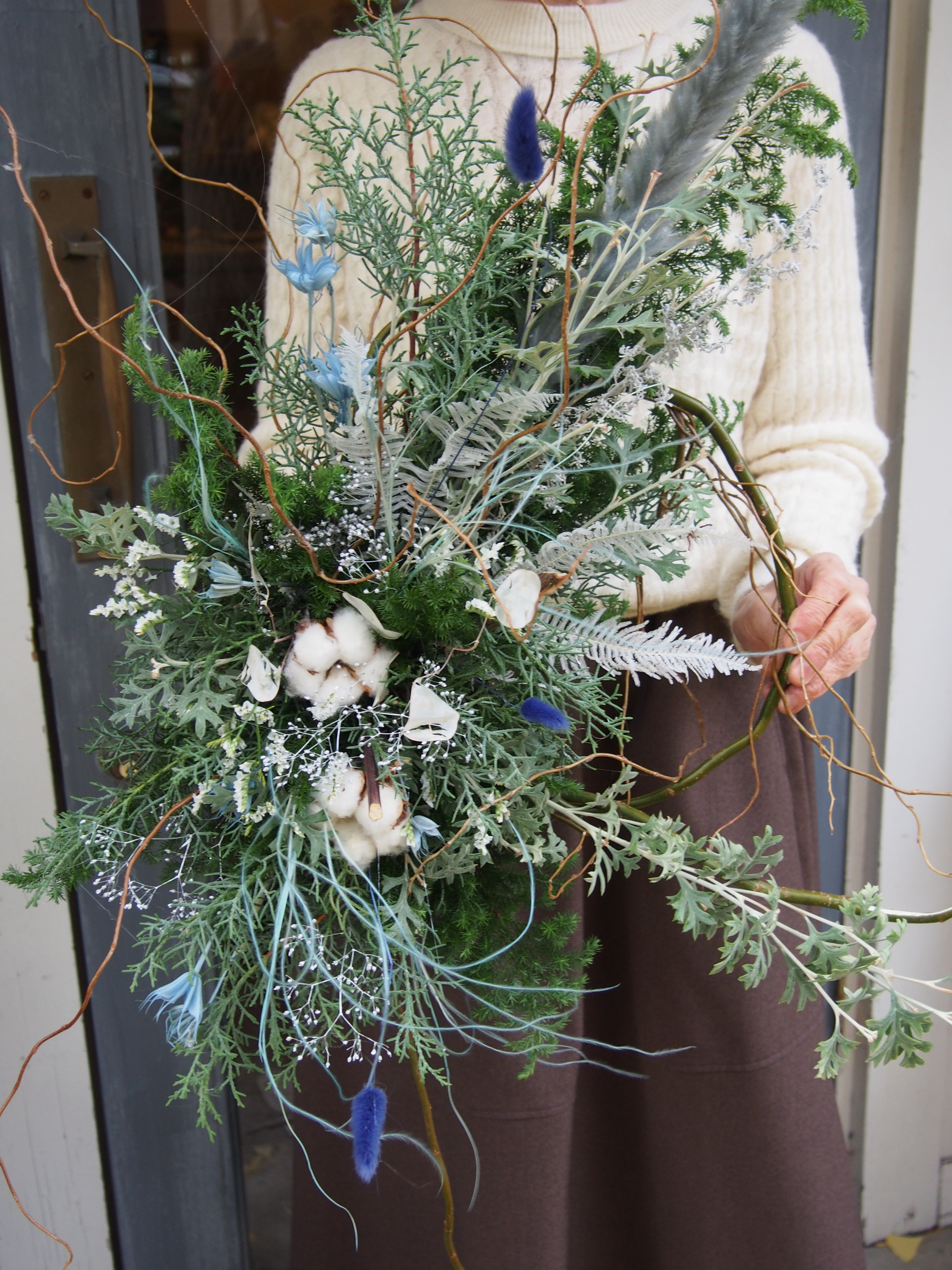 ツルに動きがあってバサっとかわいいリースになりました!ブルーがポイントです!